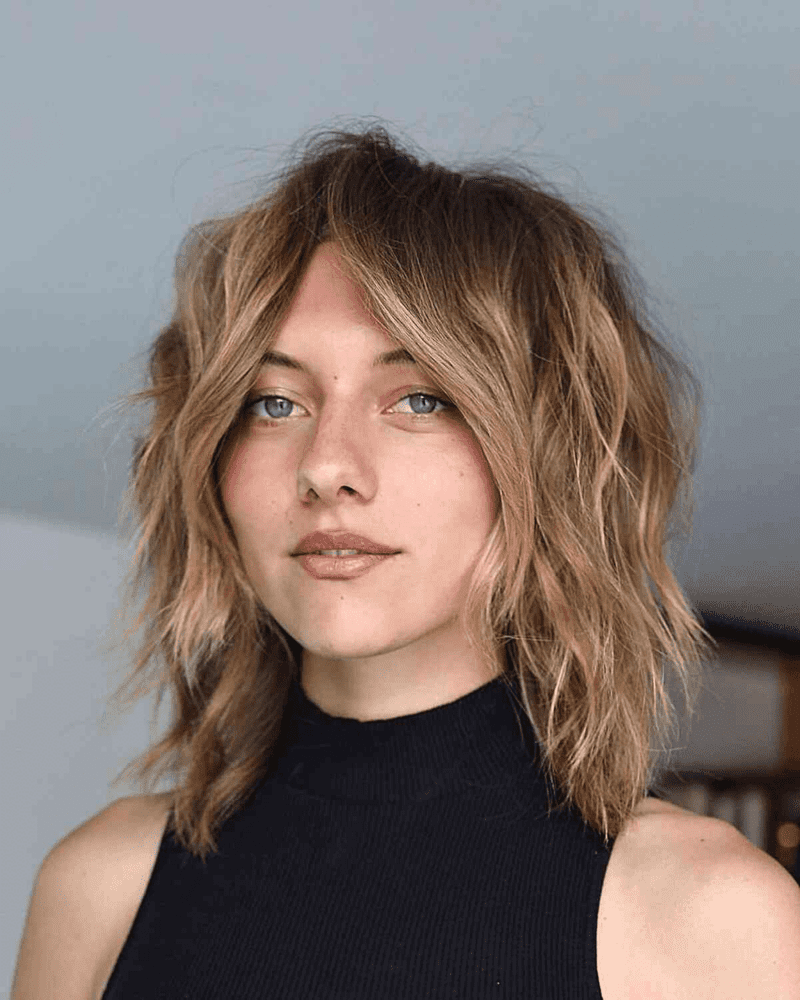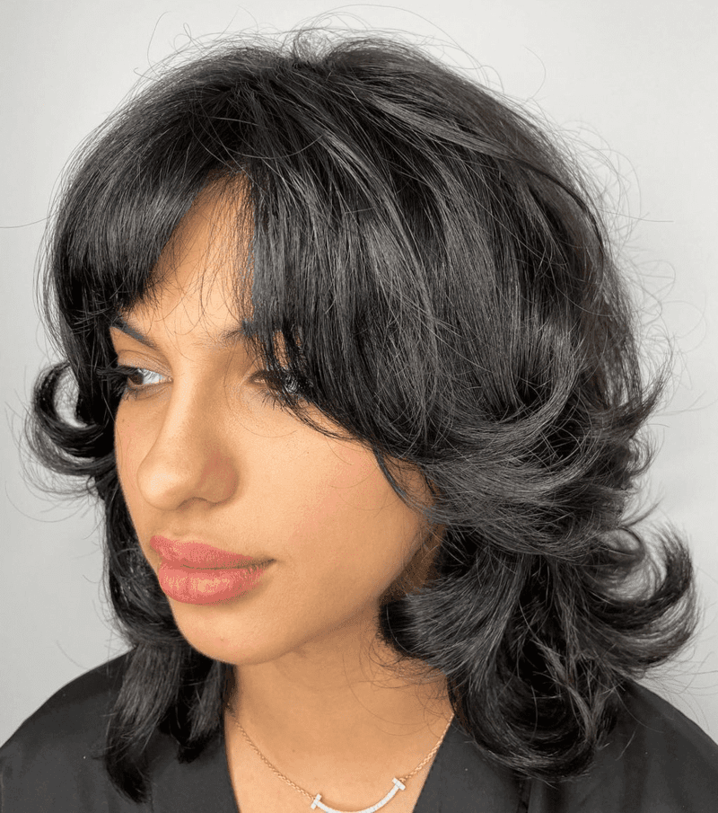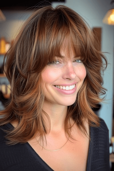 This medium-length haircut boasts multiple layers that enhance texture and volume. Wispy bangs add a romantic touch and make the style even more captivating.
