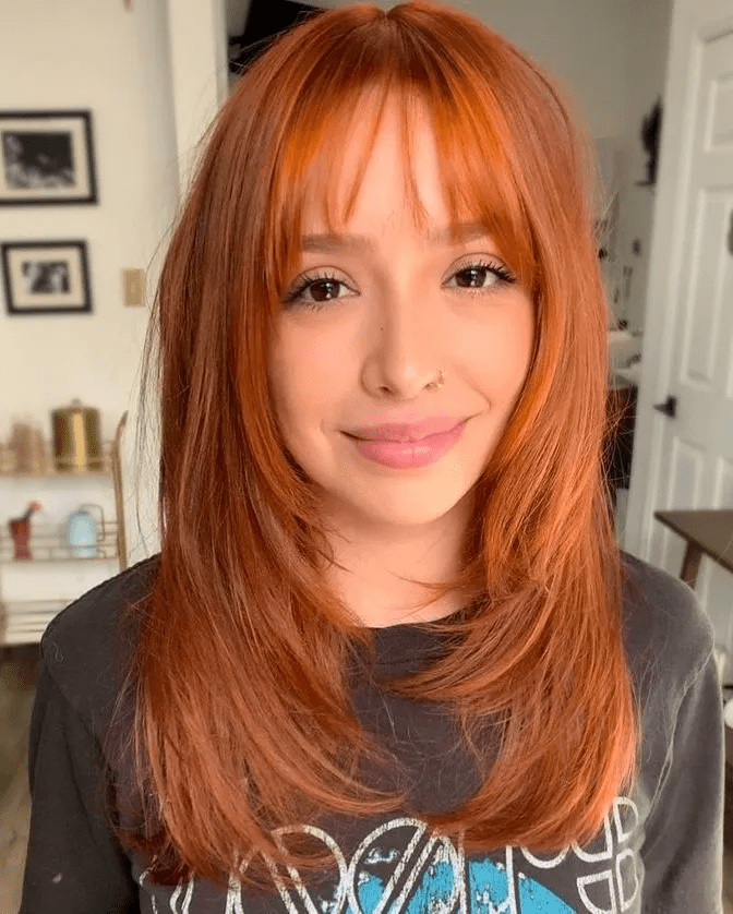 If you’re ready to stand out and attract admiring glances, consider a mid-length layered haircut with long side bangs. The long layers and bangs deliver a dramatic flair, while a vibrant copper shade adds the finishing touch to this eye-catching look.