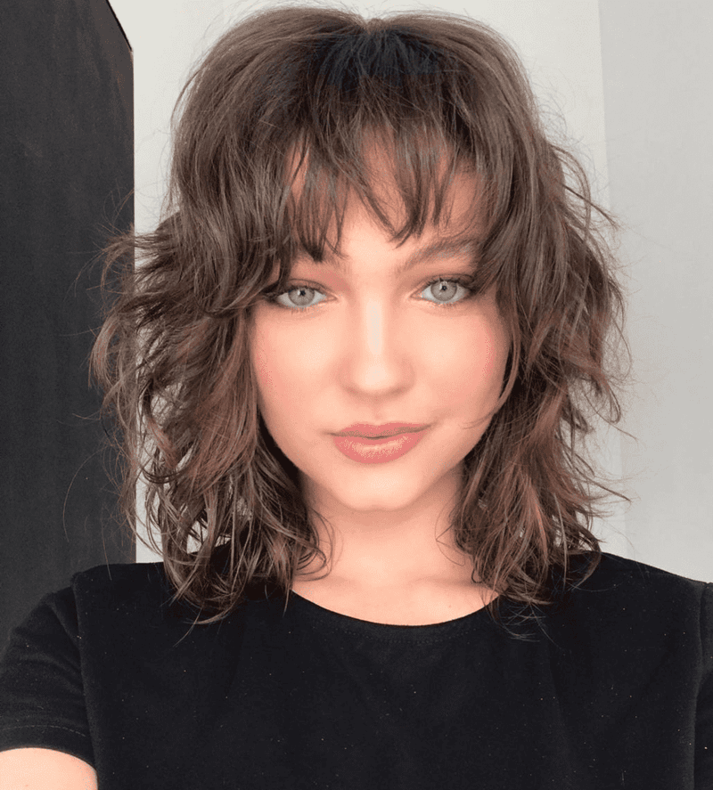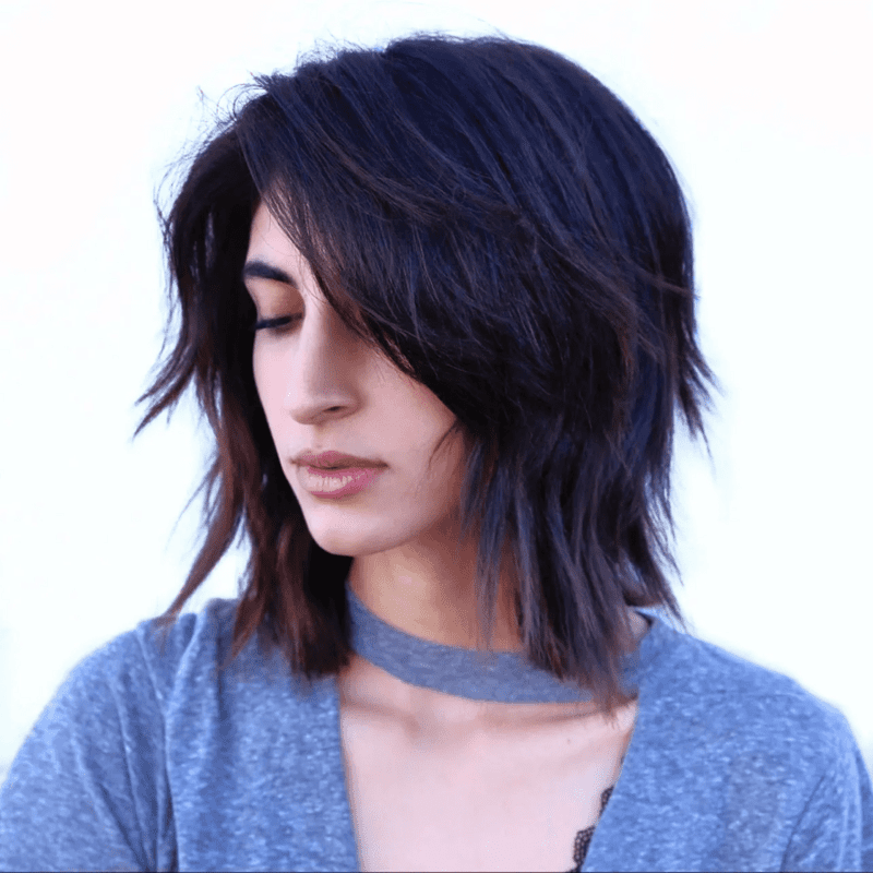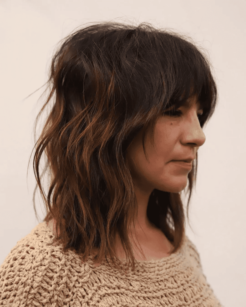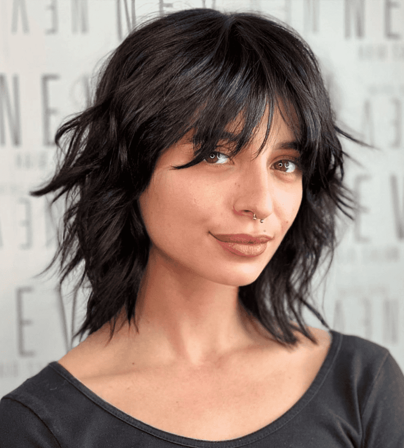 A shaggy haircut with thin, piece-y bangs offers a fun and youthful twist on shoulder-length hair. Like other layered styles, a shaggy bob adds plenty of volume and movement, making it a great choice for both thick and thin hair.