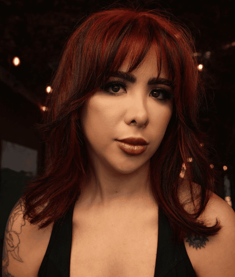 CHERRY RED MID-LENGTH HAIRCUT WITH BANGS