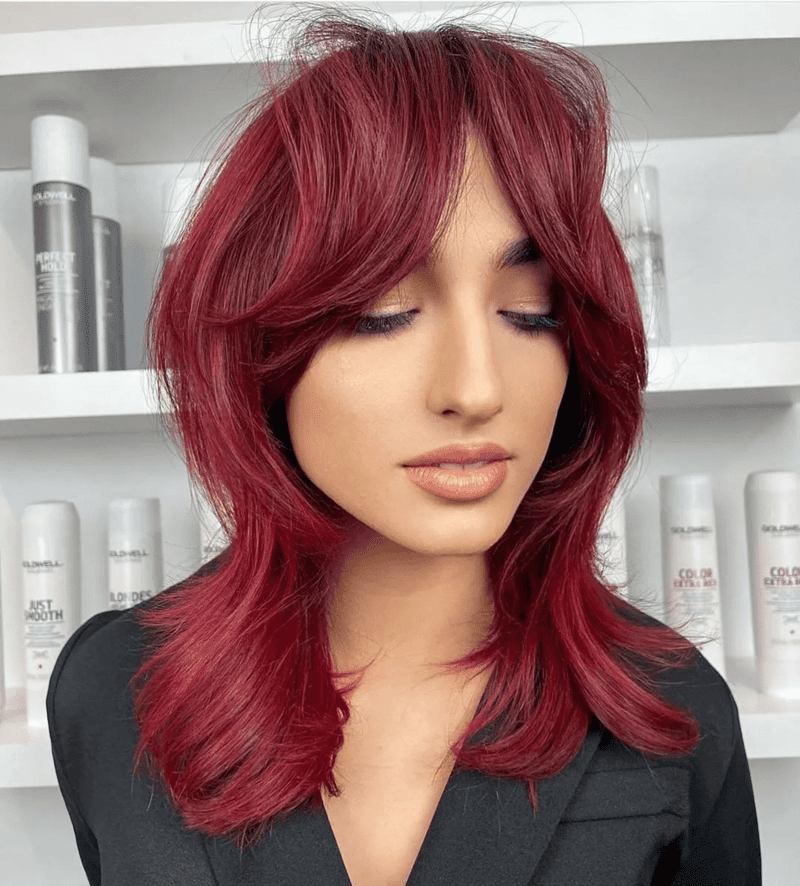 Medium-length hair may seem ordinary, but it can be anything but. Elevate your medium-length locks with flattering layers, stylish curtain bangs, and a vibrant hair color, such as this striking cherry red.