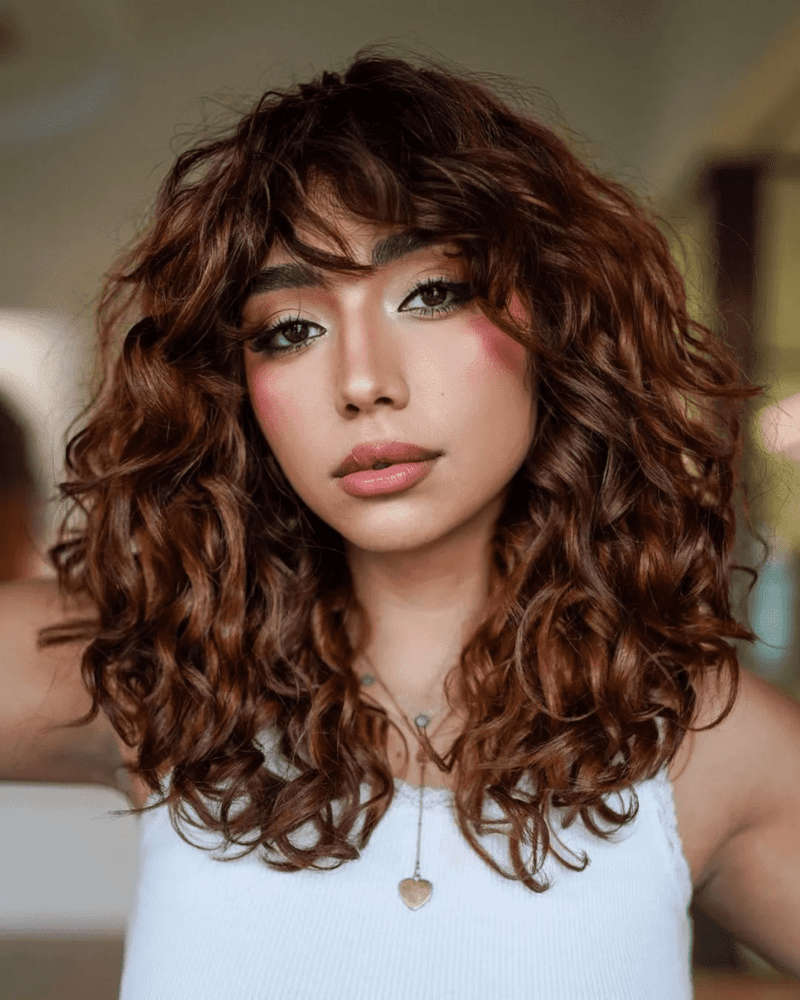 Curls and layers are a perfect match! Layers enhance the definition and bounce of curls, so if you’re a curly girl looking for a beautiful transformation, consider this style. Medium-length curly hair paired with short bangs creates an adorable combination you’ll definitely want to try!