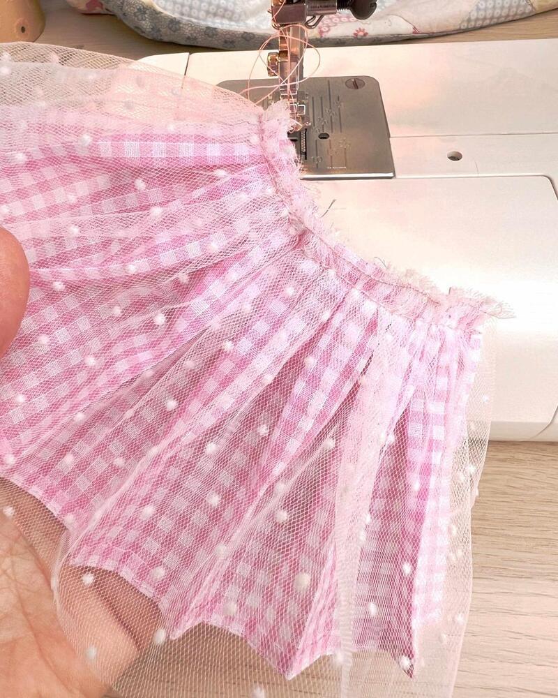 Cut a piece of tulle or netting to match the depth of your hemmed skirt and twice the width. Sew two rows of gathering stitches along the top edge. Gently pull the threads to gather the tulle until it matches the width of the bodice.