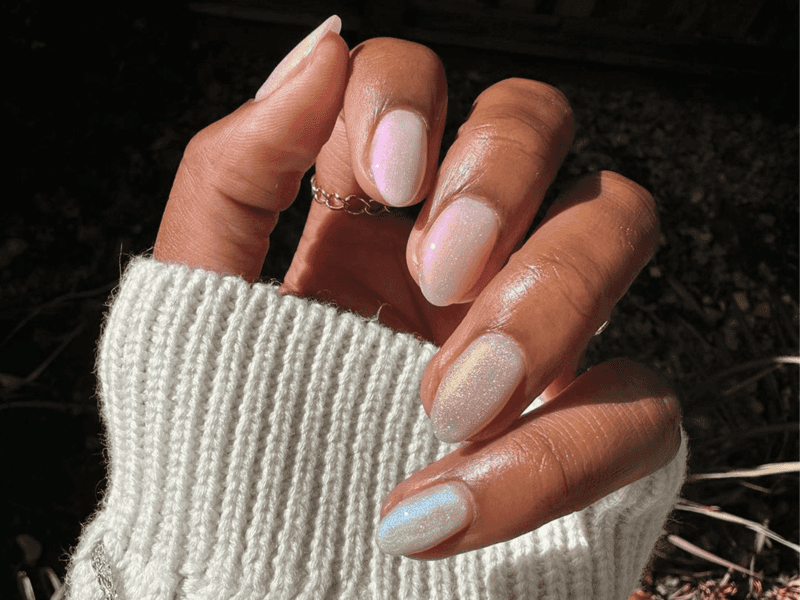 Iridescent polish lends itself seamlessly to a gentle ombre manicure like the one portrayed here. The soft gradient effect it produces is truly captivating, emitting a warm and faded glow that adds a touch of elegance. For a subtle appearance, experiment with an ombre either starting from the tip of the nail or cascading down from the cuticle. For a more dramatic impact, go all in with full coverage across the entire nail. This versatile design allows you to tailor the level of sparkle to suit your desired look.