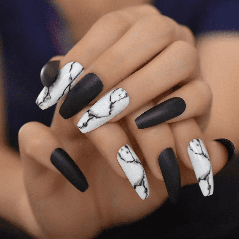 Channel a dreamy, ethereal vibe with blue marble nails! Paint your nails a base coat in a light blue or white. Then, using a nail art brush and various shades of blue polish, create swirling marble patterns on each nail. For a touch of extra dimension, add thin streaks of white or silver polish to accentuate the marble effect.