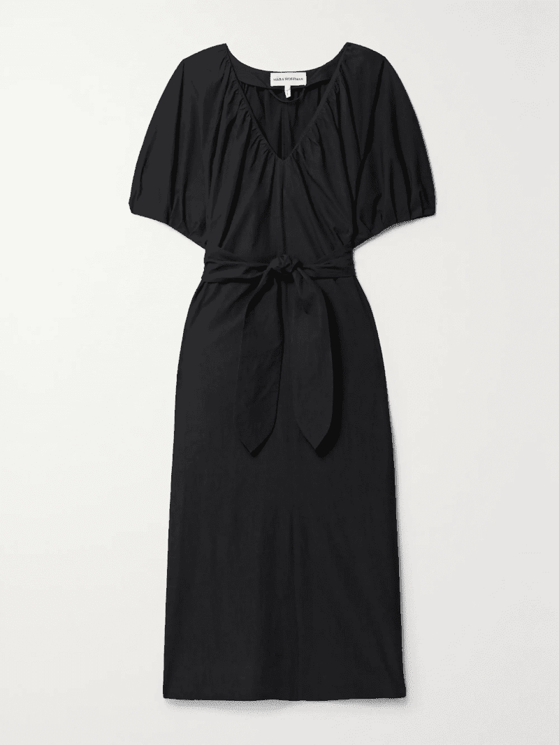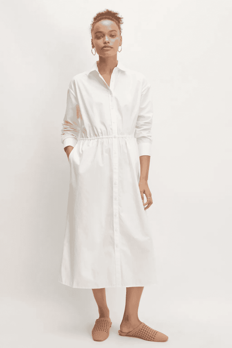 Everlane’s The Supima® Cotton Midi Shirt Dress is a relaxed and polished option for summer wear. Made from luxurious Supima® cotton, known for its extra-long fibers that result in a noticeably soft feel and added durability, this dress offers both comfort and style. The design features a classic shirt silhouette with a long-sleeved button-up front and a midi length that falls below the knee. A relaxed fit with a self-fabric drawcord at the waist allows for easy adjustability and a flattering silhouette on various body types. The Supima® Cotton Midi Shirt Dress is a versatile piece that can be dressed up with heels and a statement necklace for a summer evening out, or dressed down with sandals and a denim jacket for a casual brunch. Plus, Everlane’s commitment to ethical and sustainable practices ensures you can feel good about looking good in this timeless summer staple.