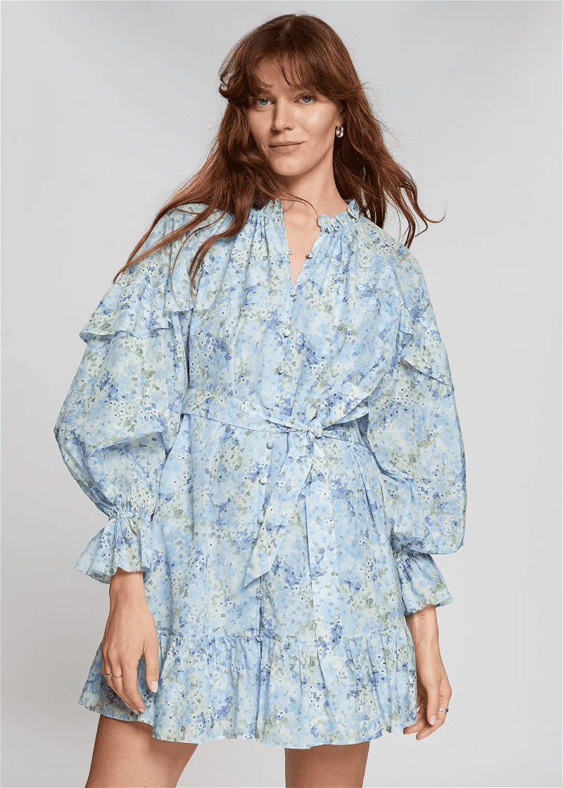 The Batsheva + Laura Ashley Rhys Belted Crochet-Trimmed Cotton-Poplin Mini Dress is a delightful marriage of two iconic design houses. This dress embodies a whimsical femininity with a base of crisp cotton poplin featuring a charming floral print. The collaboration celebrates Laura Ashley’s legacy of playful prints, reimagined by Batsheva Hay’s romantic aesthetic. Delicate ivory crochet trims gracefully accentuate the ruffled details, adding a touch of vintage charm. The silhouette is a mini length, perfect for showing off your legs, and a self-cinching belt creates a flattering cinched waist. This dress is a delightful choice for summer soirees or a romantic day out.
