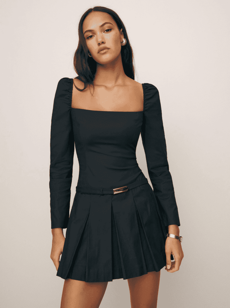 The Reformation Luella Dress is a summer staple that combines elegance and practicality. This mini dress features a square neckline that flatters various necklines and shoulder shapes. The long sleeves offer a touch of coverage and sophistication, making it suitable for cooler summer evenings or air-conditioned spaces. The key element of the Luella Dress lies in its pleated skirt. The pleats add a touch of femininity and movement, while also helping to camouflage any unwanted curves. Made from Reformation’s signature sustainable materials, the dress likely drapes beautifully and feels comfortable against the skin. Available in a variety of colors and prints, the Reformation Luella Dress is a versatile piece you can dress up with heels and statement earrings for a night out, or keep casual with sandals for a daytime brunch.