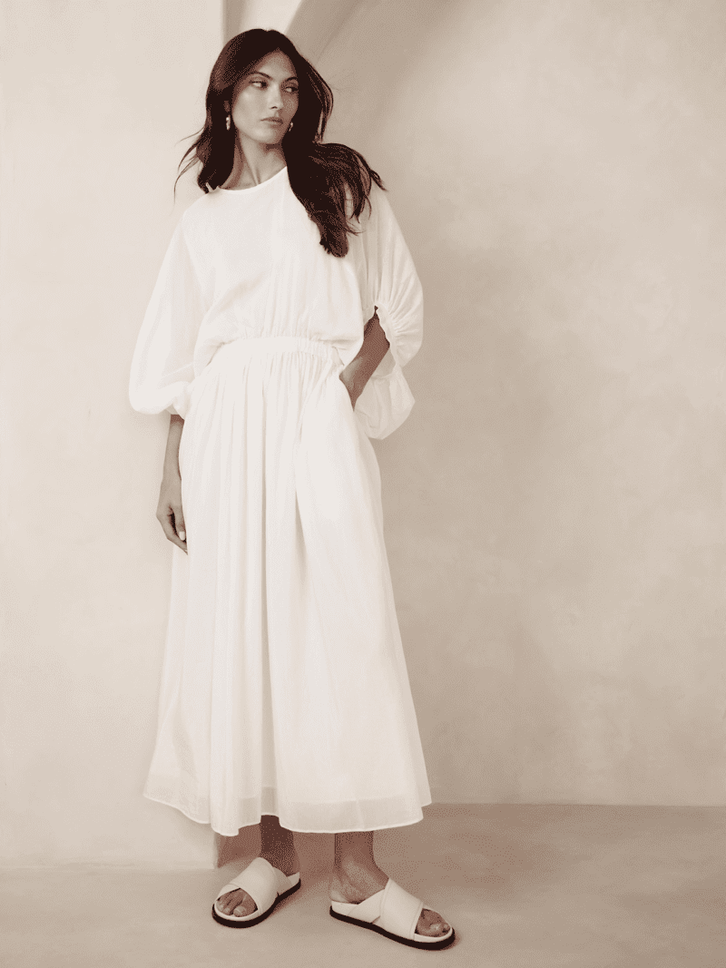 Banana Republic’s Eliana Cotton-Silk Dress offers a perfect blend of comfort and sophistication for warm-weather occasions. This feminine midi dress is crafted from a delightful semi-sheer voile fabric that combines the breathability of cotton with the luxurious drape of silk. The relaxed fit with a blouson sleeve and flowing skirt creates a flattering silhouette that’s easy to move in. Delicate details like a wide crew neck and elastic cuffs with a waistband add a touch of polish. The bodice and skirt are lined for added comfort, while the unlined sleeves offer a touch of airy elegance. Available in various colors, the Eliana Cotton-Silk Dress is a versatile piece you can dress up with heels for a summer wedding or dress down with sandals for a breezy brunch.