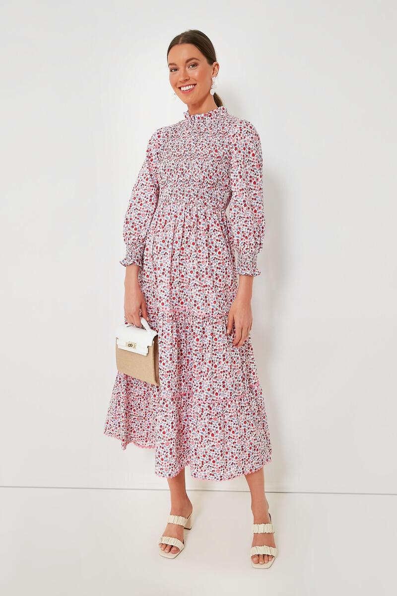 The Scarlet Forest Isabel High Neck Dress by Pink City Prints is a charming and versatile choice for summer days. This dress embodies a feminine and vintage feel with a block print design in vibrant shades of red and blue hues. Crafted from organic cotton, it features a comfortable and flattering silhouette. The key elements include a high ruffled neckline for a touch of whimsy, a smocked bodice that cinches the waist, and a flowy tiered skirt with a playful ric rac trim. The Isabel High Neck Dress is available in midi length and offers side seam pockets for added convenience. With its unique print and comfortable design, this dress is perfect for a variety of occasions, from summer weddings and afternoon tea parties to weekend getaways.