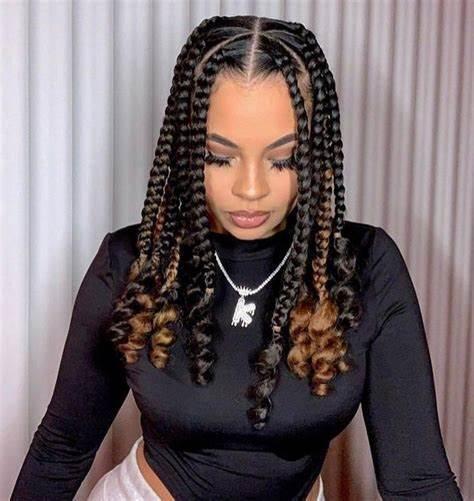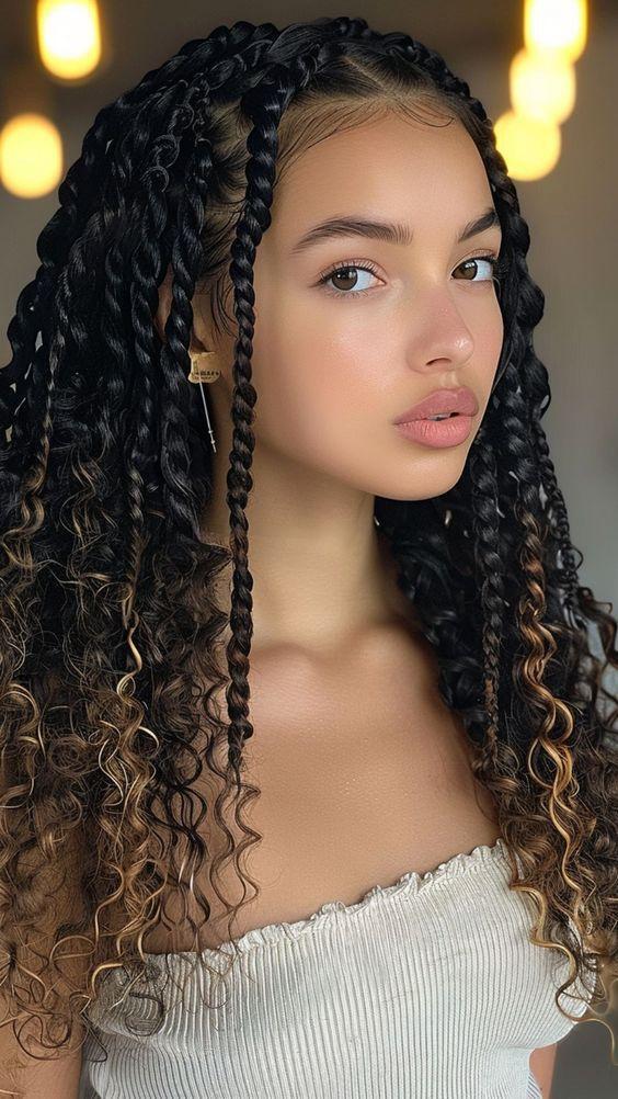 Goddess braids with curls create a captivating and feminine look by blending the sleekness of braids with the playful charm of curls. This style typically features cornrow-style goddess braids with the ends left loose and curled, or includes curly extensions to add volume and length.