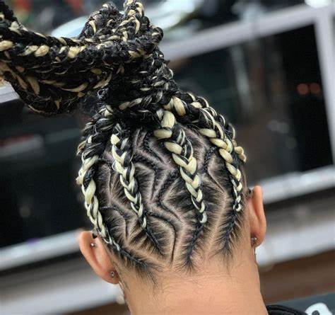 Goddess braids styled in a zigzag updo offer a blend of playful charm and sophistication. The braids are first arranged in a zigzag pattern across the scalp, creating a striking visual effect and setting it apart from traditional straight-back styles. Once the zigzag pattern is in place, the braids are gathered into an updo—whether it’s a high bun, a series of twists, or an elaborate design that continues the zigzag theme. This style highlights the intricate braiding pattern and is also a practical way to keep hair away from the neck and face, making it a versatile choice for both casual and formal occasions.