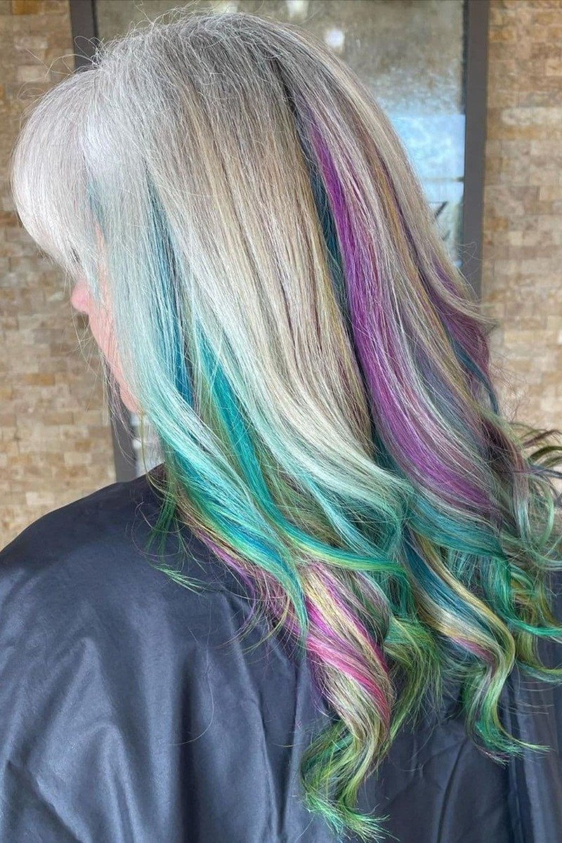 Add a touch of whimsy to your silver hair with pastel highlights, lowlights, peek-a-boo color, or an ombre. This playful technique creates an ethereal look that suits all hair types.