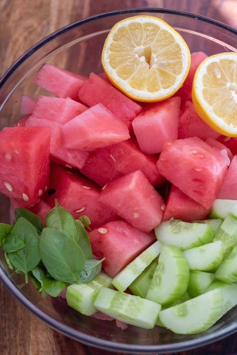 “Place the cubed watermelon, cucumber, basil, and lemon juice into a blender or food processor and blend until smooth.