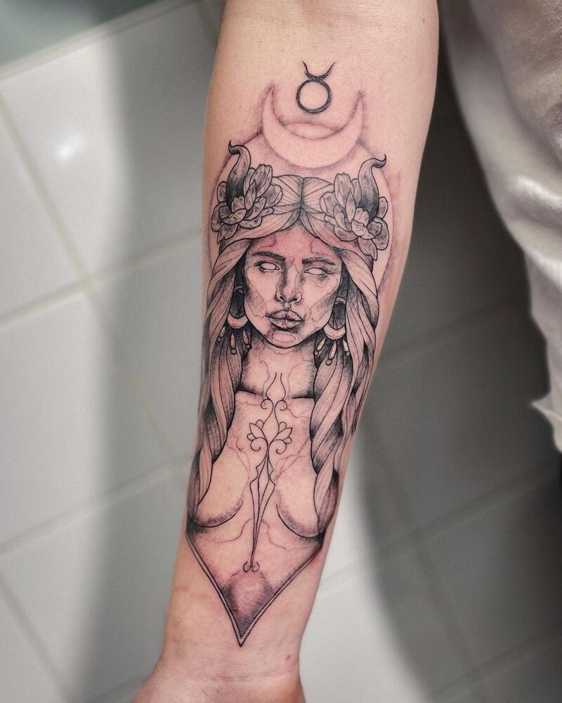 Venus, the goddess of beauty, love, and prosperity, rules the Taurus zodiac sign. People with Taurus traits often seek love and can be very possessive in relationships. Getting a tattoo of Venus can symbolize these aspects of love and beauty. Additionally, bull art tattoos are significant in tribal mythology, representing virility and strength.