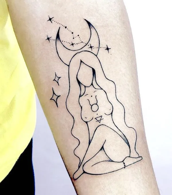 Tattooing a full figure can be overwhelming due to its intricate details. This design, however, opts for a faceless approach, focusing on the body and zodiac symbols to maintain a more streamlined look.