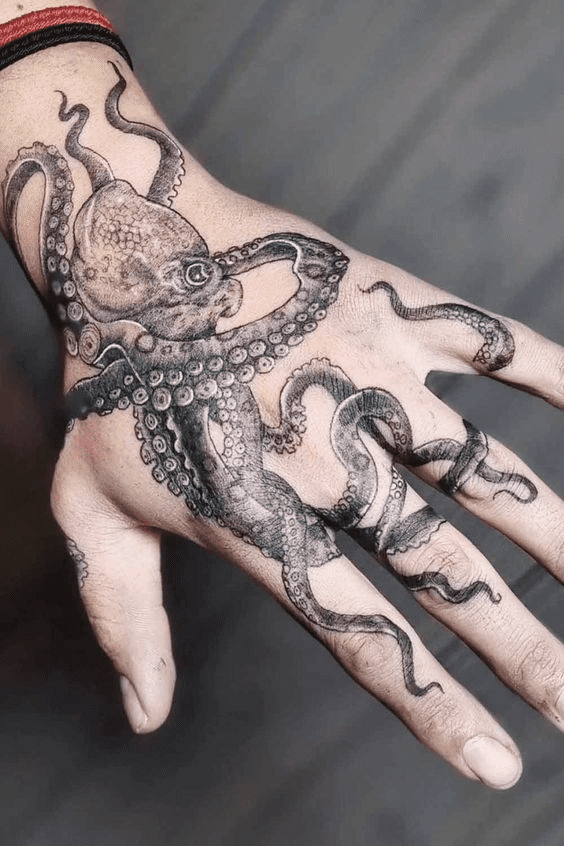 An octopus tattoo is a striking choice for the hand, with its tentacles gracefully extending down your fingers. This creates a sense of movement and dynamism, making your tattoo come alive with every gesture.