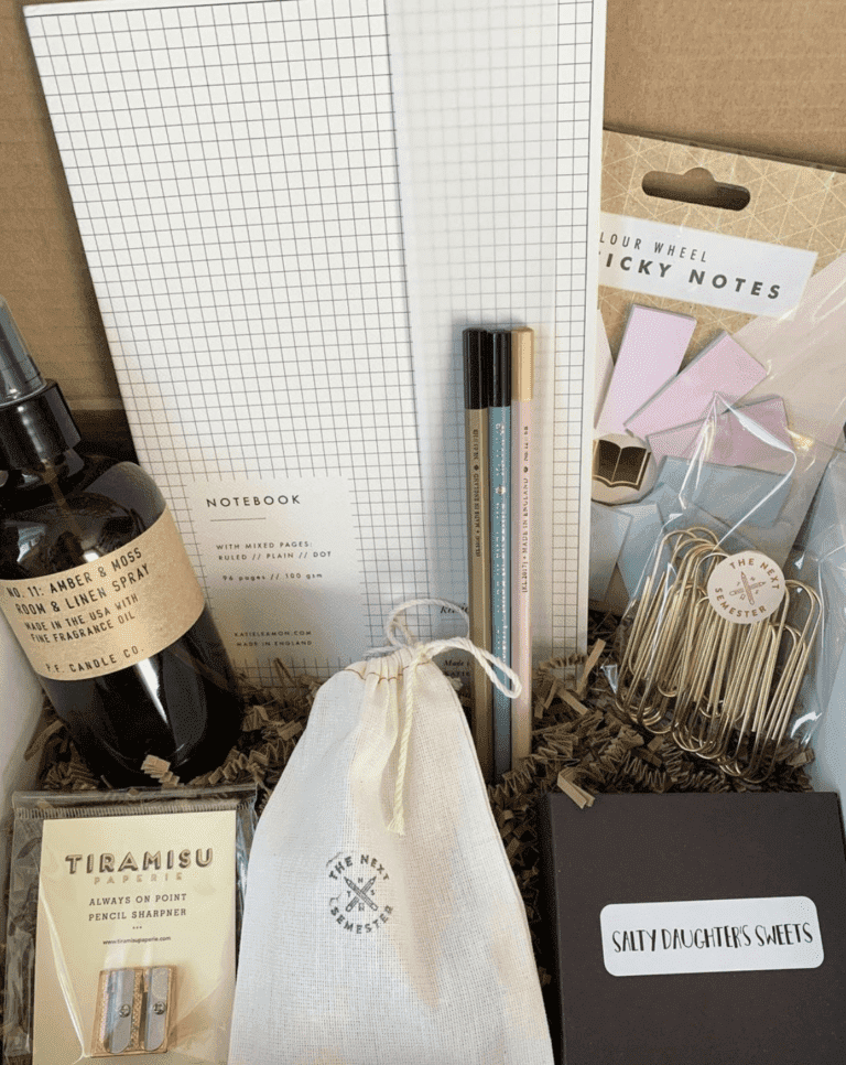 This practical college care package will help your loved one stay organized. Fill it with productivity essentials like planners, desk calendars, sticky notes, pens, highlighters, and stationery. To make it extra stylish, choose matching sets from brands like Rifle Paper Co. for a chic and coordinated touch!