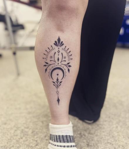 Ornamental tattoo designs can vary widely, but they often incorporate popular motifs such as mandalas, triangles, swirling lines, and spirals. These shapes are typically arranged in symmetrical, visually pleasing compositions. Additionally, organic elements like flowers, leaves, vines, and ornamental stars enhance the designs with natural beauty.