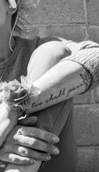 If you’re getting this tattoo on your forearm, make the most of the space. A phrase in cursive font along the side of the forearm creates a stunning look.