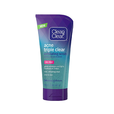 Clean and Clear Triple Cleanse Exfoliating Scrub: This everyday acne face scrub fights breakouts by taking away skin oil and gently scrubbing, treating acne, and also calming the skin.