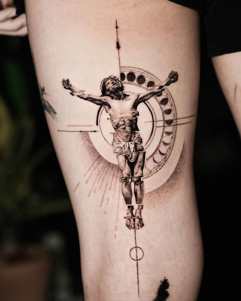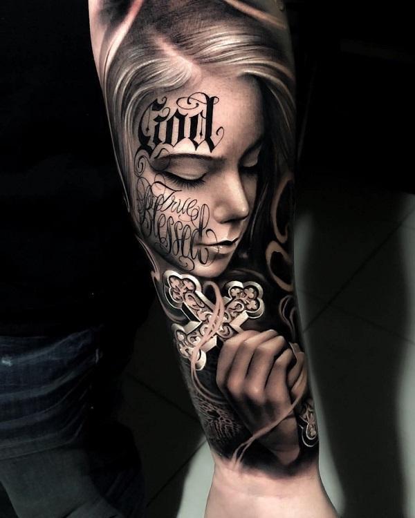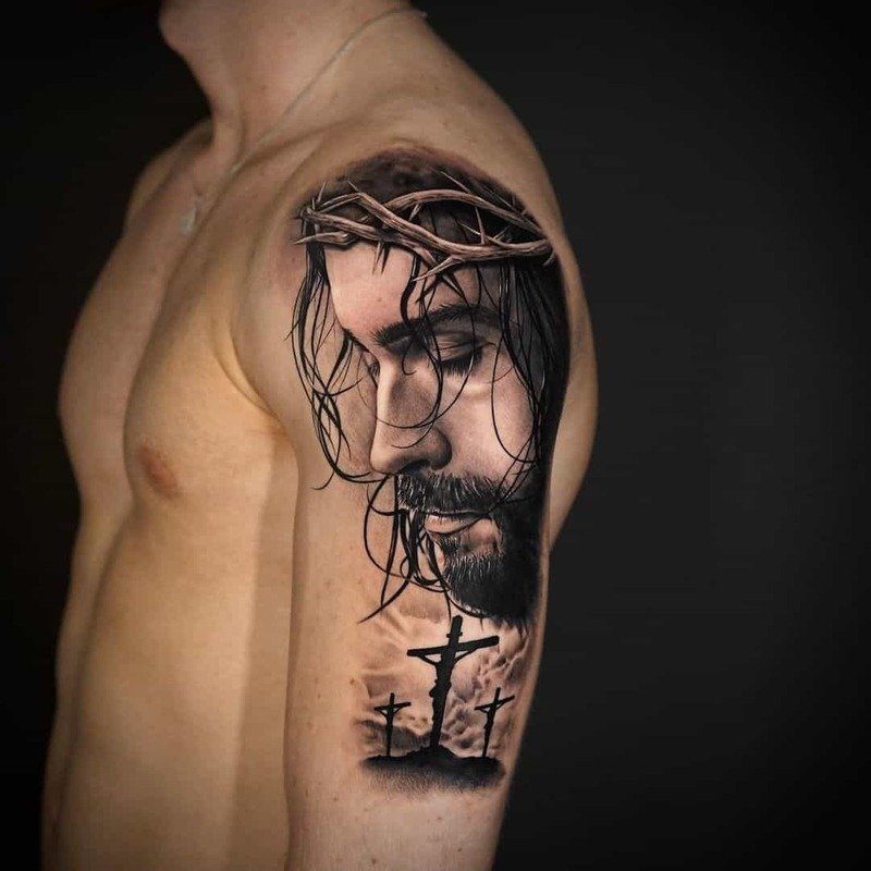 This realistic tattoo is a stunning and meaningful piece of artwork. The details in the design highlight the artist’s skill and meticulous attention to detail, effectively conveying a powerful message about faith or spirituality. Its unique realism and complexity make it stand out among other tattoos, ensuring it will be admired by many.