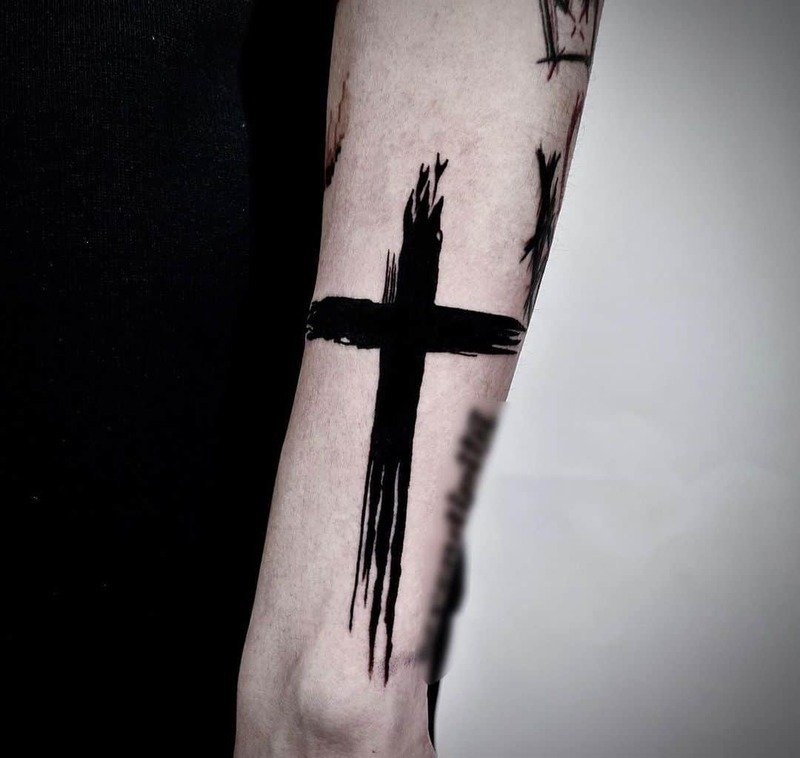 A big black cross tattoo on the wrist is a prominent piece that makes a bold statement due to its size and placement. This tattoo is ideal for those who seek a visible reminder of their faith or wish to express their spirituality. The tattoo can range from a simple outline to a more intricate featuring shading and detailed elements.