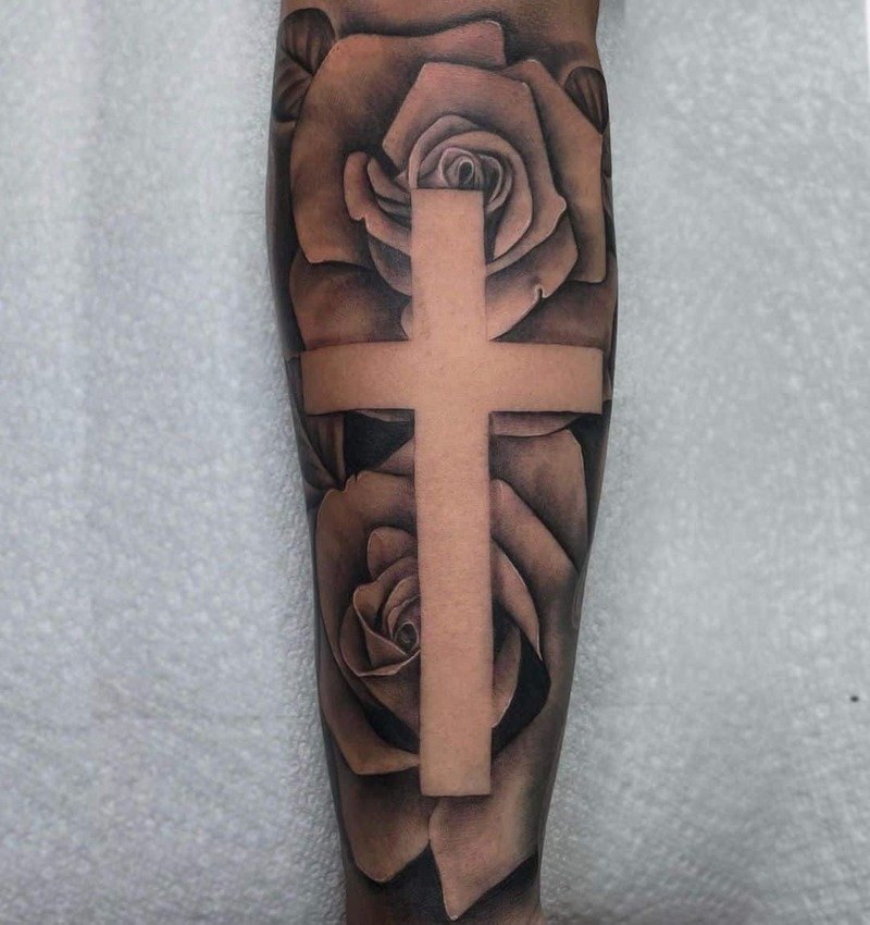 The rose cross tattoo features a cross adorned with intertwined or surrounding roses. The rose typically symbolizes beauty, love, and passion, while the cross represents faith and spirituality. This combination creates a unique and meaningful tattoo that embodies the balance between beauty and faith. The design can be executed in various styles, ranging from simple black and white to vibrant and realistic interpretations, allowing for personalization that reflects the wearer’s aesthetic preferences and deeper meanings.