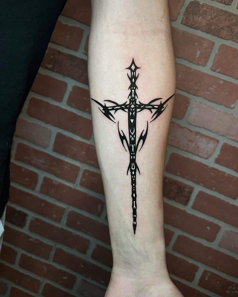 Tribal cross tattoo blend traditional tribal patterns and motifs with the classic cross shape. Inspired by the ancient tribal art of various cultures, such as Polynesian, Maori, and Native American, these tattoos showcase bold lines, geometric shapes, and details, resulting in a unique and striking appearance. The meaning behind tribal cross tattoos can vary based on the specific culture they draw from, but they generally symbolize faith, strength, and heritage.