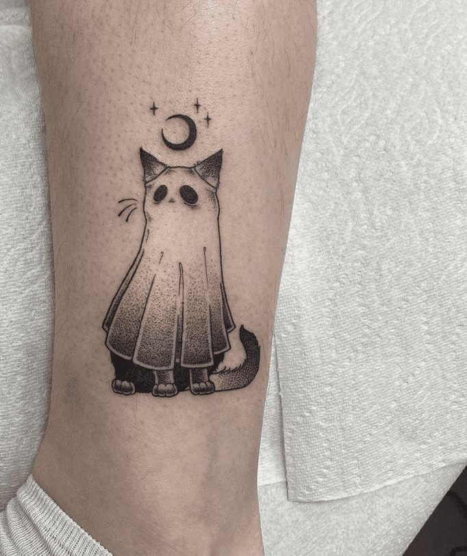 This adorable tattoo puts a cute spin on the quintessential Halloween symbol: the black cat. The feline is depicted wearing a ghostly costume and gazing up at the night sky, where a crescent moon and stars twinkle. It’s the perfect choice for women who love cats and appreciate the playful side of Halloween.
