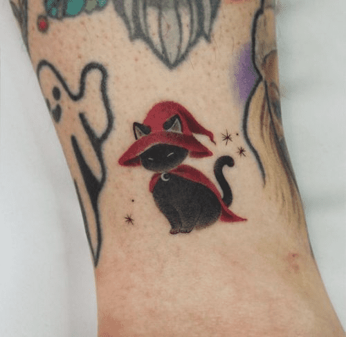 Black cats are a Halloween icon, and this tattoo features a mystical twist. A sleek black cat wears a vibrant red witch’s hat, creating a striking visual contrast. This design would make a perfect matching tattoo for friends who share a love for Halloween’s mysterious elements.
