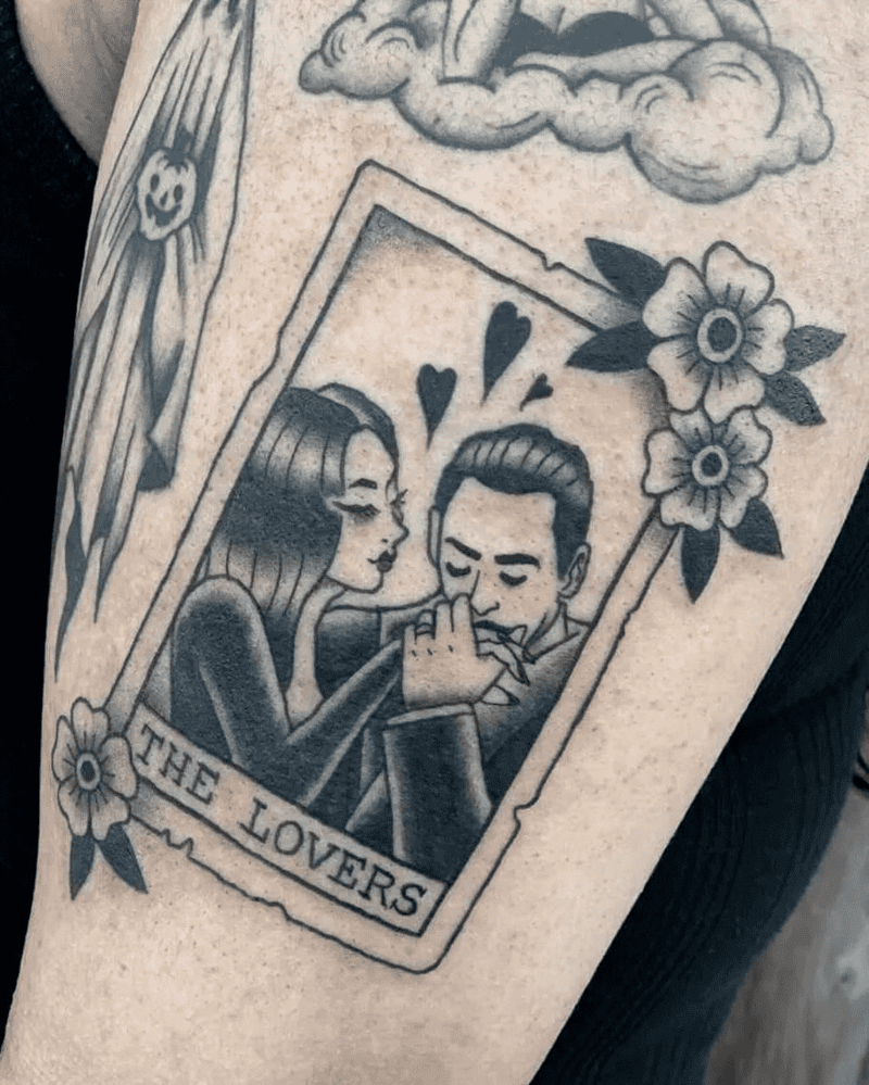 For fans of the macabre and romantic, this tattoo inspired by The Nightmare Before Christmas is a perfect choice. The iconic couple is reimagined in a tarot card design, labeled “The Lovers,” merging the world of Halloween fantasy with the allure of vintage flash art.