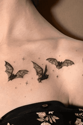 This tattoo evokes the quiet dusk with three bats gracefully soaring through the sky. Delicate lines highlight the intricate details of their wings, while tiny stars create the impression of an early evening sky. It’s a subtle and cute Halloween tattoo idea for those who prefer a minimalist design.