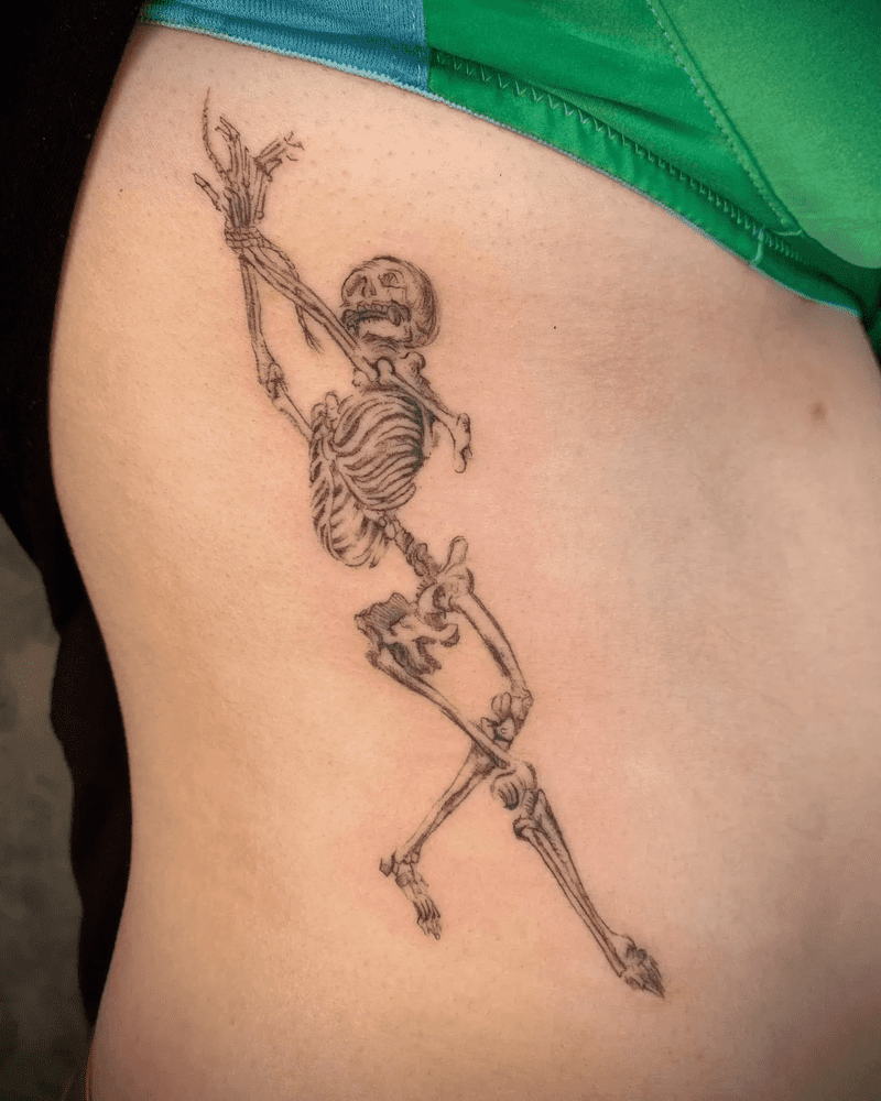 This light-hearted skeleton tattoo captures the fun side of Halloween. The skeletal figure dances in a relaxed pose, grinning mischievously. It’s a simple line art design that’s perfect for those who enjoy Halloween but prefer a more understated tattoo.