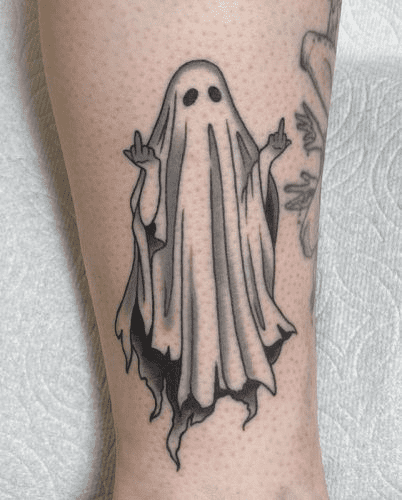 This cute ghost tattoo captures the light-hearted spirit of Halloween. A friendly specter floats gracefully, its hands raised in a playful greeting. With its simple lines and soft shading, this ghost has a charming and approachable presence. It’s the perfect choice for a small, cute Halloween tattoo on your wrist or ankle.