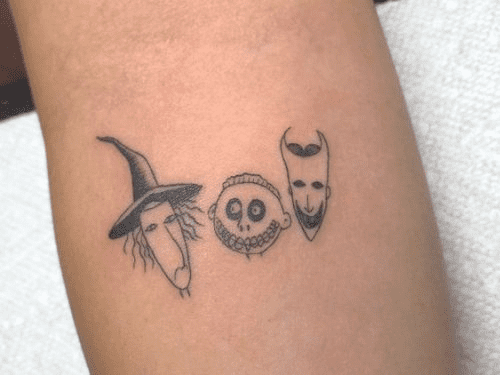 Why choose just one when you can have them all? This tattoo features a delightful trio of Halloween icons: a witch’s hat, a grinning skull, and a devilish character. Each figure is stylized with personality and flair, creating a cute and expressive tattoo that’s both simple and fun.