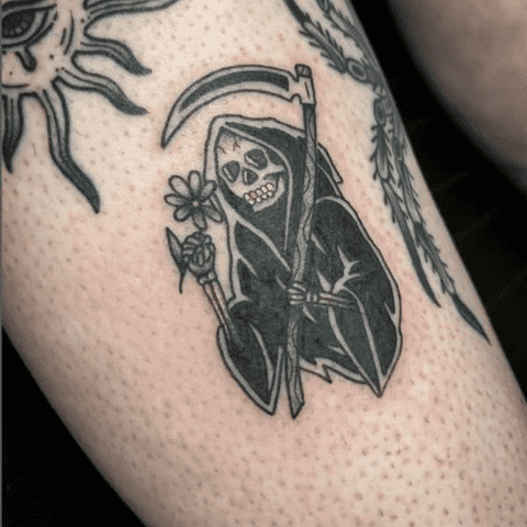 The Grim Reaper is often associated with fear, but this tattoo offers a softer interpretation. Holding a bouquet of flowers, this Reaper appears ready to spread kindness rather than collect souls. It’s a quirky and cute Halloween tattoo idea that subverts traditional themes.