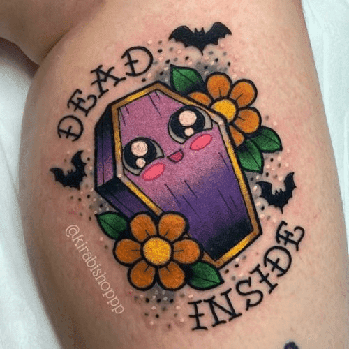 This vibrant tattoo features a coffin with adorable eyes, surrounded by colorful flowers and friendly bats. The playful lettering adds a touch of humor, making it a perfect choice for a cute Halloween tattoo with a dash of dark humor.