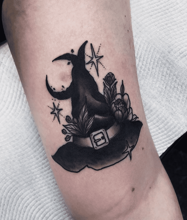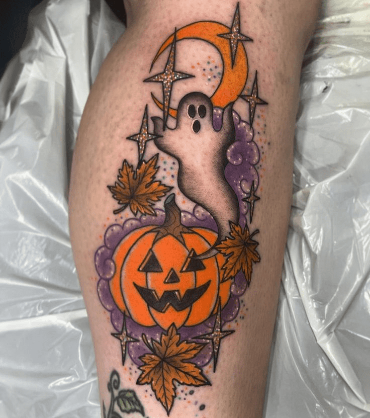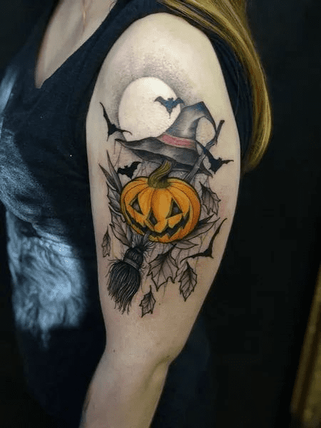This enchanting tattoo elevates the Halloween theme to cosmic heights. A witch’s hat and wand, adorned with stars, evoke the magic of a clear October night sky. The soft pink accents and whimsical design make it a dreamy choice for those who prefer a more enchanting Halloween experience.