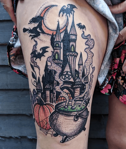 This playful tattoo features ghosts emerging from a bubbling cauldron, creating a vibrant and festive Halloween scene. The adorable ghostly expressions make it a delightful choice for those who prefer a more charming approach to Halloween tattoos.