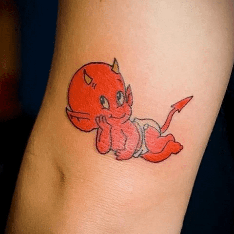 This playful demon tattoo captures the spirit of Halloween with a touch of irreverence.