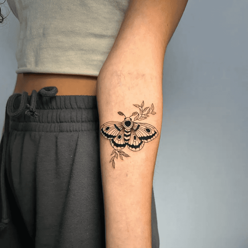 This moth tattoo features a creature with eyes that hold untold secrets, fluttering through the shadowy realm of Halloween night. The intricate wings and haunting gaze make it a captivating choice for anyone drawn to the enigmatic and slightly eerie side of the natural world.
