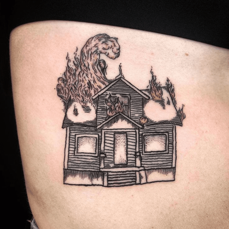 This tattoo features a house engulfed in flames, creating a striking contrast with its sweet pink exterior. It’s a powerful metaphor for the fiery spirit within and a bold statement for those who enjoy tattoos that tell a story with a touch of humor.