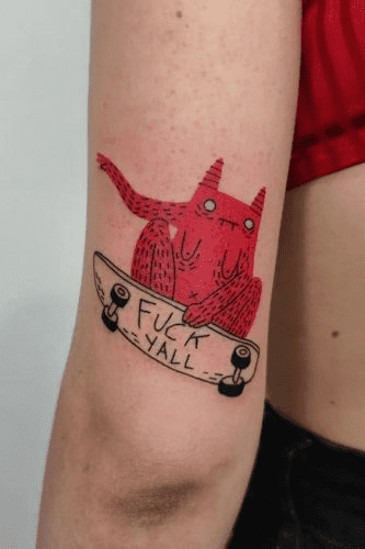 This tattoo features a devilish character, full of sass and rebellion. Holding a banner with the phrase “F*ck y’all,” it’s a playful nod to Halloween’s rule-breaking tradition. Perfect for those who wear their rebellious spirit as a badge of honor.