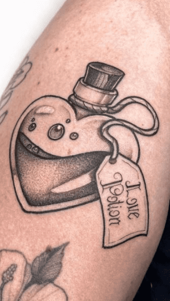 Halloween isn’t just about spooks and scares; it’s also about enchantment and wonder. This tattoo captures that magic with a vintage-style love potion bottle, complete with a heart-shaped potion and a tiny top hat on the label. It’s a whimsical and romantic tattoo idea that’s perfect for those seeking a touch of enchantment.