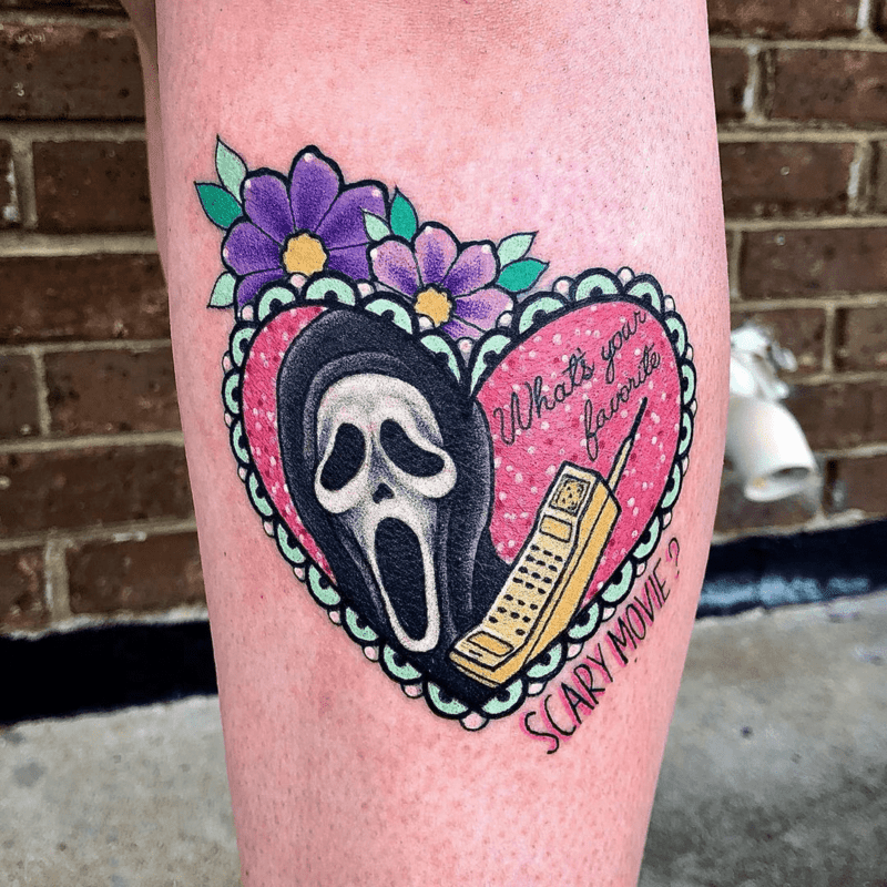 This tattoo combines the chilling allure of a classic horror scream mask with the warmth of a vibrant pink heart. It’s a perfect blend of edgy and adorable, ideal for those seeking a cute Halloween tattoo that makes a bold statement.