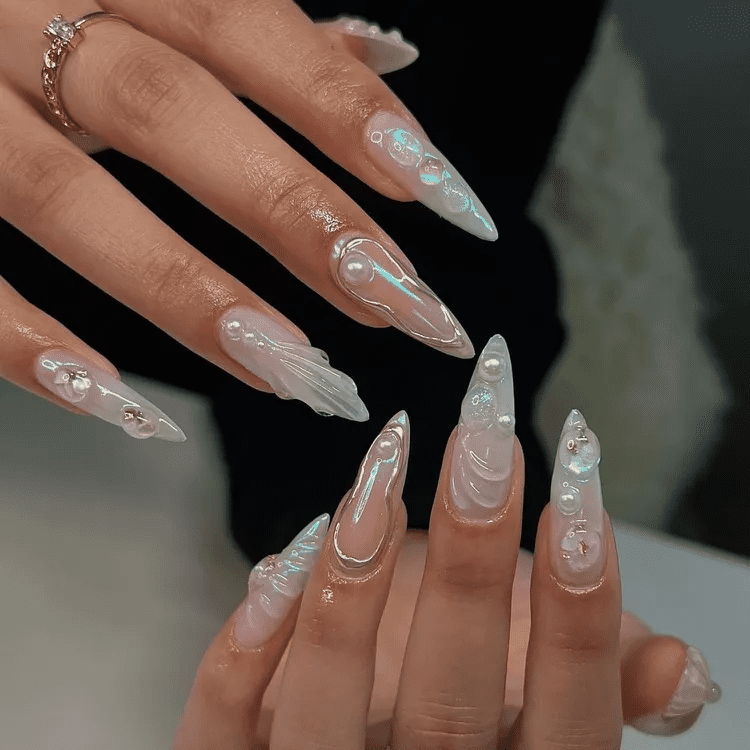 Elevate your mermaid mani to new heights with sculpted pearl nails! This luxurious technique takes your nails to the next level, literally. Using special acrylic or gel materials, your nail technician can create delicate, 3D pearls right on your nails. Imagine tiny, perfectly round pearls with a soft, pearly sheen that look almost real. These sculpted pearls can be placed on a bed of shimmery polish that evokes the ocean depths, or they can be used to create more elaborate designs, like miniature seashells or even a tiny mermaid crown. This is a perfect choice for those who want a truly special and unforgettable mermaid manicure. It’s guaranteed to turn heads and make you feel like royalty of the undersea world!