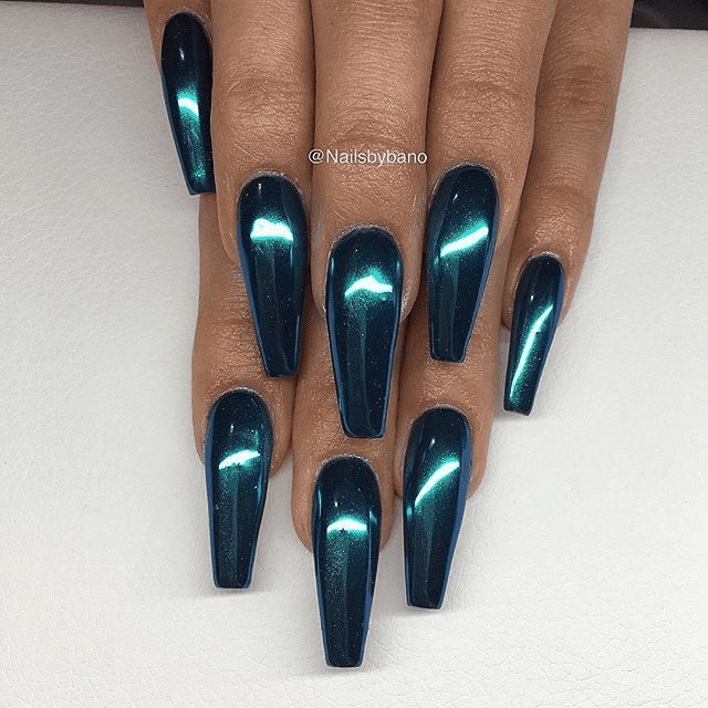Dive into the mysterious depths with deep sea chrome nails! This mesmerizing look captures the feeling of the ocean’s twilight zone, where sunlight barely reaches. Imagine a base coat of dark, rich blue or emerald green that shimmers with a chrome finish. But unlike regular chrome, this one has a hint of something hidden beneath the surface. A subtle, smoky effect or a touch of inky black peeking through the chrome creates a sense of depth and mystery. It’s like looking into the unknown abyss of the ocean and catching a glimpse of something magical. This sophisticated and dramatic manicure is perfect for those who want a mermaid mani that’s both glamorous and a little bit haunting.