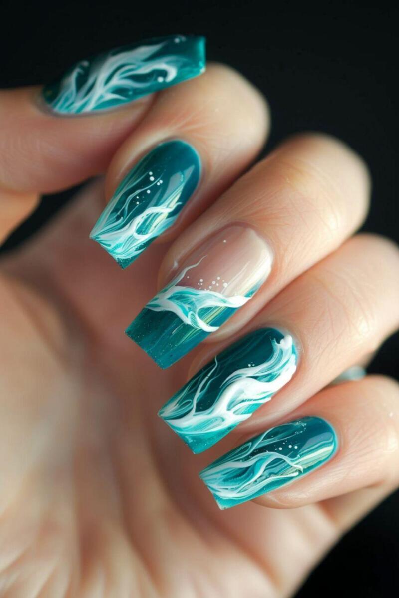 Capture the ocean’s beauty with teal and sea green waves on your nails. Add delicate white lines for a foamy touch. This design is perfect for summer occasions or a green dress with blue undertones.