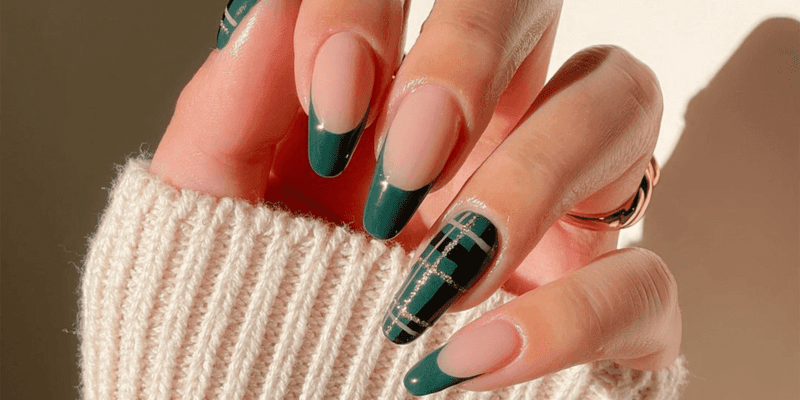 Add a touch of classic charm with a green tartan plaid nail design over a neutral base. This sophisticated look is perfect for complementing your green dress.